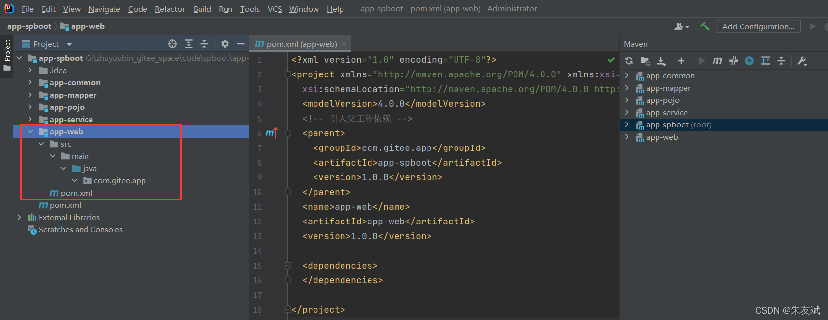 在子工程【app-web】的pom文件中,添加【web】依赖,并且创建【Application】启动类。