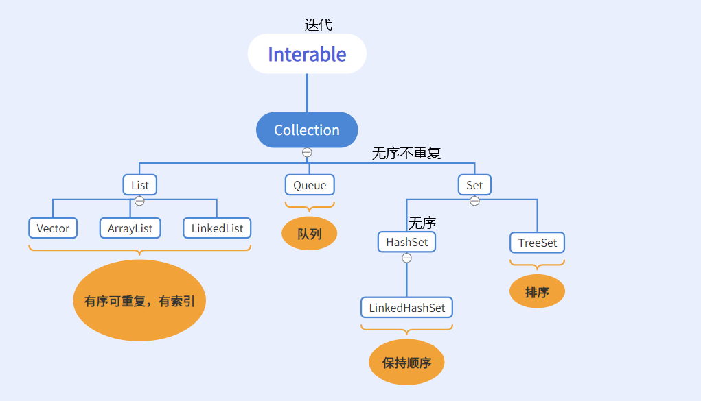 - Collection接口有三个子接口。Collection 接口是 List、Set 和 Queue 接口的父接口,通常情况下不被直接使用。
