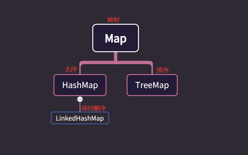 put(K key, V value) | put(K key, V value) | void putAll(Map<? extends K, ? extends V> m) | 向集合中添加指定集合中所有的键——值映射关系 | boolean containsKey(Object key) | 判断此集合中是否包含指定的键映射关系 | boolean containsValue(Object value) | 判断此集合中是否包含指定的值映射关系 | V get(Object key) | 返回指定的键所映射的值,否则返回null | Set keySet() | 以Set集合的形式返回该集合中的所有键对象 | Collection values() | 以Collection集合的形式返回该集合中的所有值对象 | V remove(Object key) | 删除并返回键对应的值对象 | boolean isEmpty() | 判断集合是否为空 | int size() | 返回集合中键——值映射关系的个数 | boolean equals(Object o) | 比较指定的键——值映射关系是否相等 | void clear() | 清空集合中所有的映射关系 |
