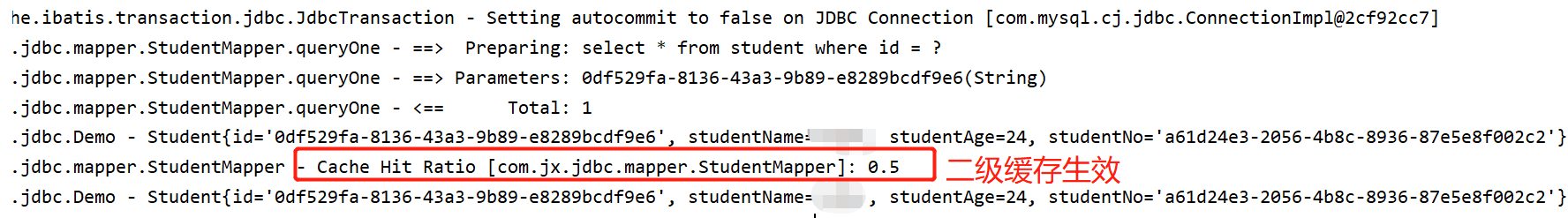 虽然代码对同一个对象进行了两次获取,但是实际只有一条SQL被执行,其原因就是使用了同一个SqlSession,当一个会话第一次通过SQL和参数获取对象后,它将会被缓存起来,如果下次的SQL和参数没有变化并且缓存没有超时或者生声明需要刷新时,那么它就会从缓存中获取数据,而不是通过SQL获取