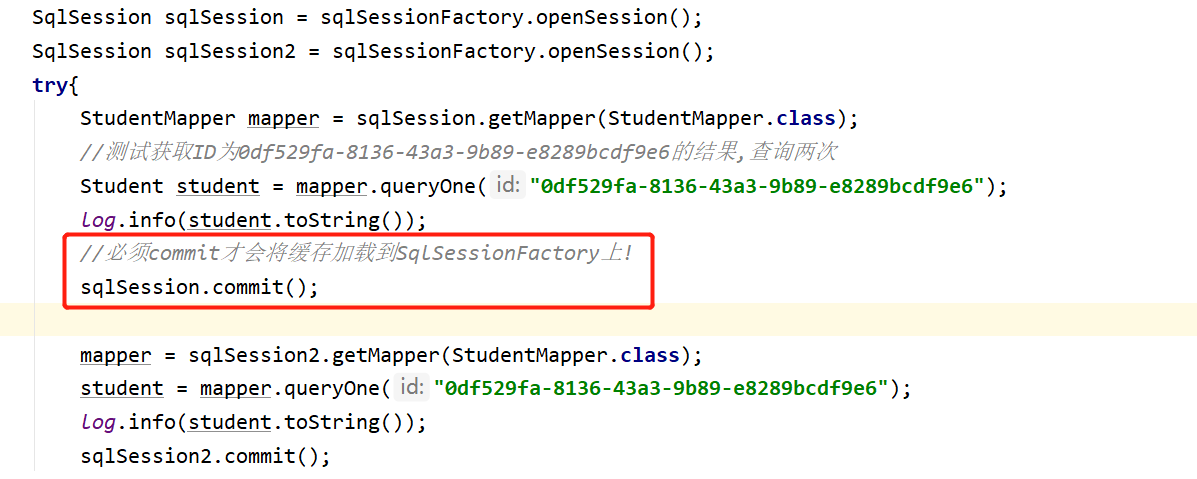 注意: 必须commit才会缓存到SqlSessionFactory上被共享!