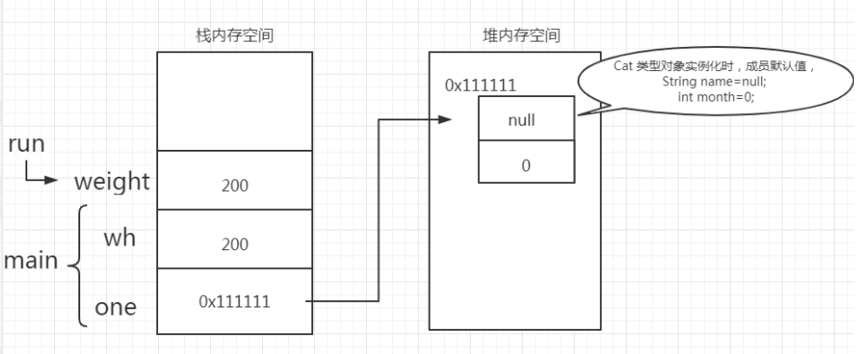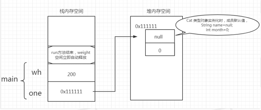 - 当调用one对象的run方法,并以wh为参数传入方法时,JVM检测到方法参数weight,作为方法局部变量,也会放入栈中,并将wh的值200复制给weight。