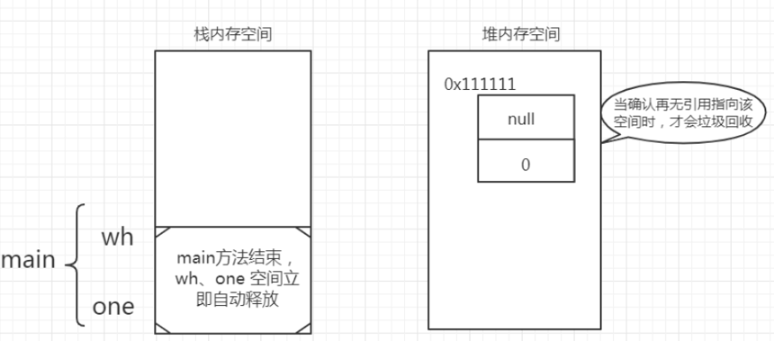 - main方法运行结束,立即释放栈中one,wh的空间,而堆中对象空间,则会当确定无引用指向该位置后,由垃圾回收机制进行回收,不会立即释放资源。
