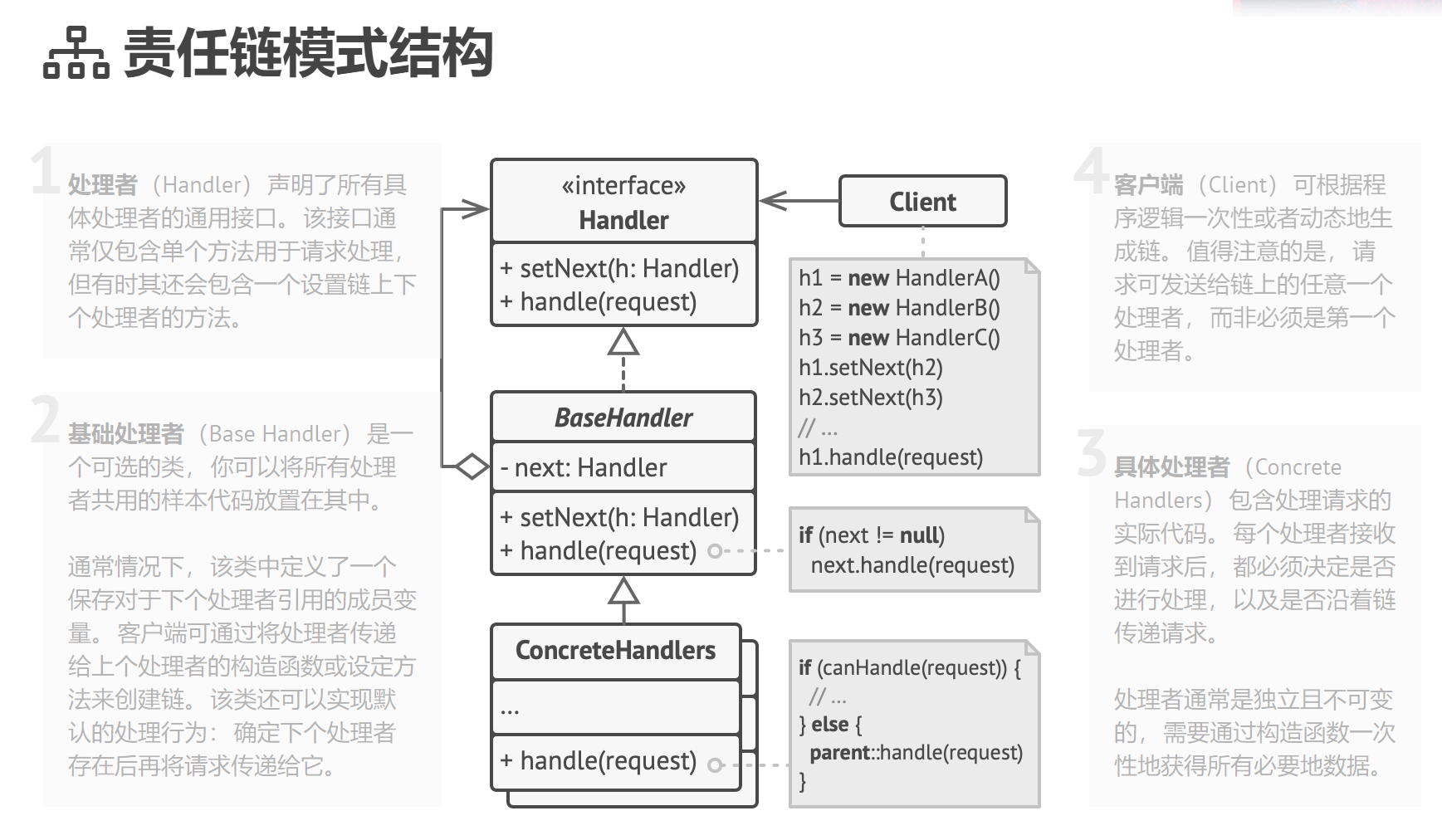 - 处理者(Handler)声明了所有具体处理者的通用接口。该接口通常仅包含单个方法用于请求处理,但有时其还会包含一个设置链上下个处理者的方法。