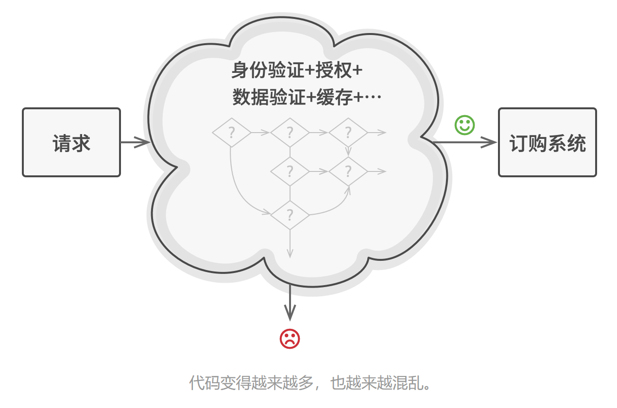 随着功能不断迭代,检查代码逐渐变得越来越混乱,修改某个检查步骤有时会影响其他的检查步骤。最糟糕的是,当你希望复用这些检查步骤来保护其他系统组件时,你只能复制部分代码,因为这些组件只需要部分而非全部的检查步骤。