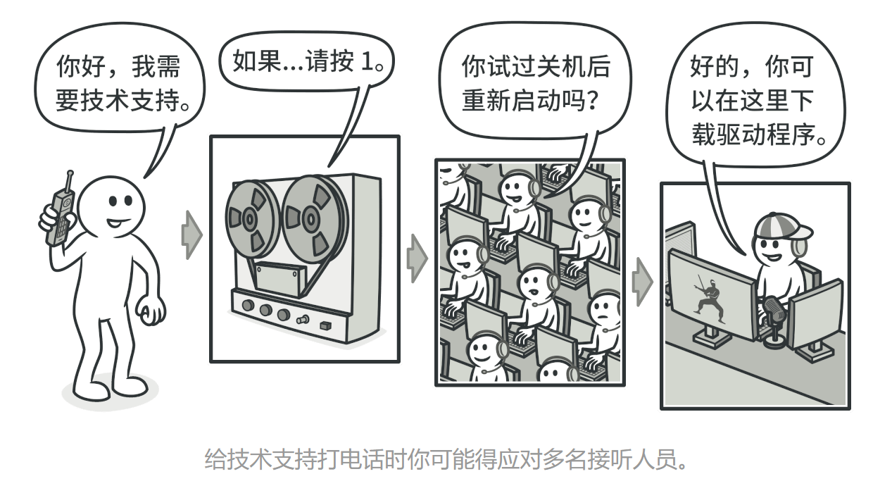 这位接听人员同样无法提供任何具体的解决方案。 他不断地引用手册中冗长的内容, 并不会仔细聆听你的回应。 在第 10 次听到 “你是否关闭计算机后重新启动呢?” 这句话后, 你要求与一位真正的工程师通话。