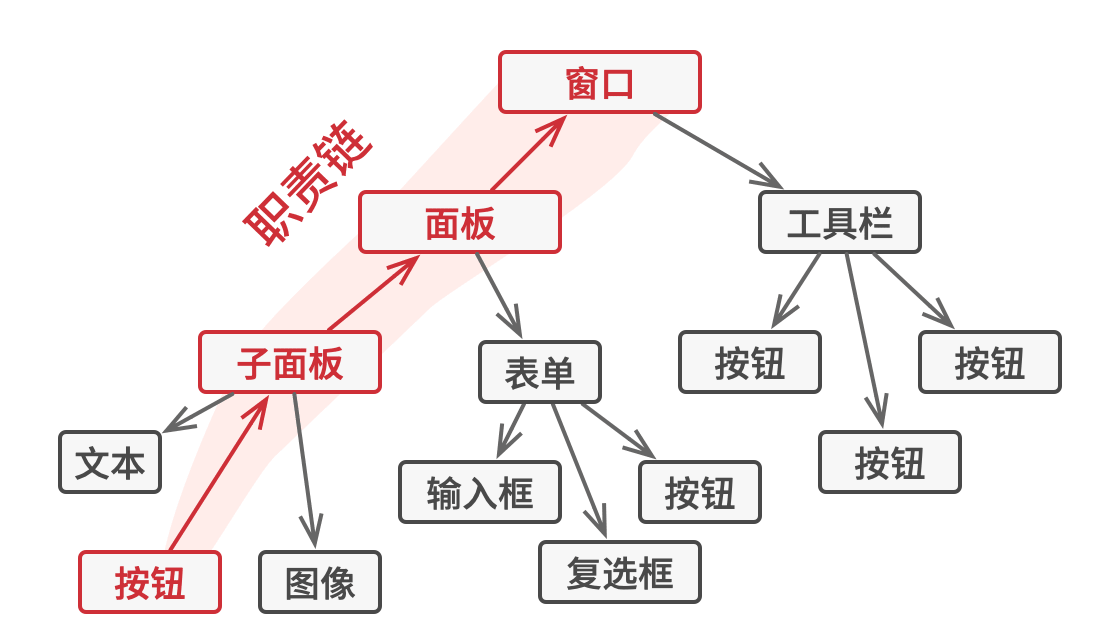 例如, 当用户点击按钮时, 按钮产生的事件将沿着 GUI 元素链进行传递, 最开始是按钮的容器 (如窗体或面板), 直至应用程序主窗口。 链上第一个能处理该事件的元素会对其进行处理。 此外, 该例还有另一个值得我们关注的地方: 它表明我们总能从对象树中抽取出链来。