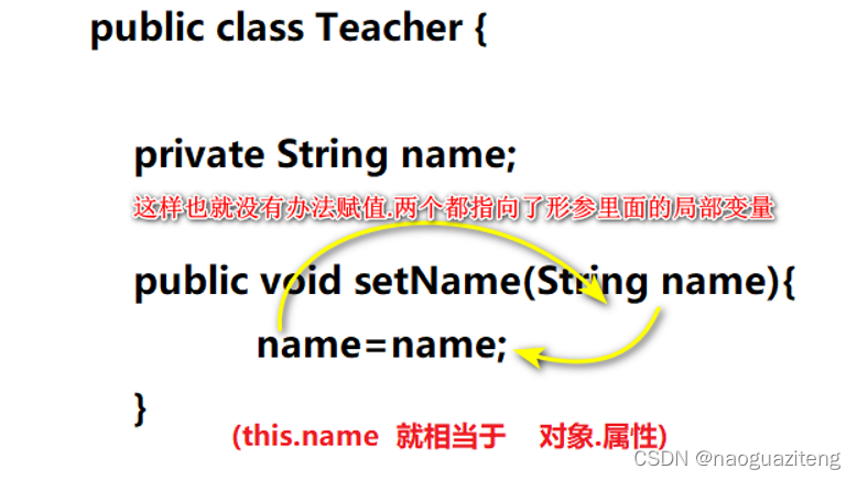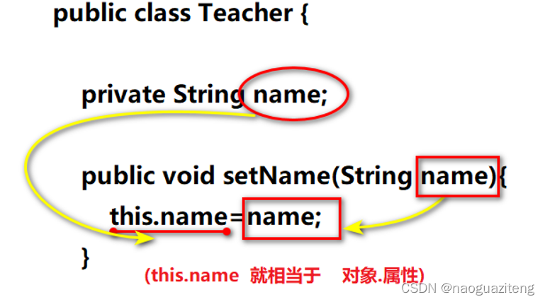 //get,set方法中的this就代表了Teacher这个当前类,Teacher这个类调用的name这个属性