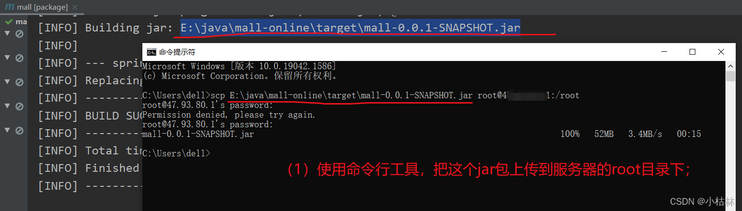 2.把程序打成的jar包,在cmd命令行中,使用scp命令,上传到服务器;