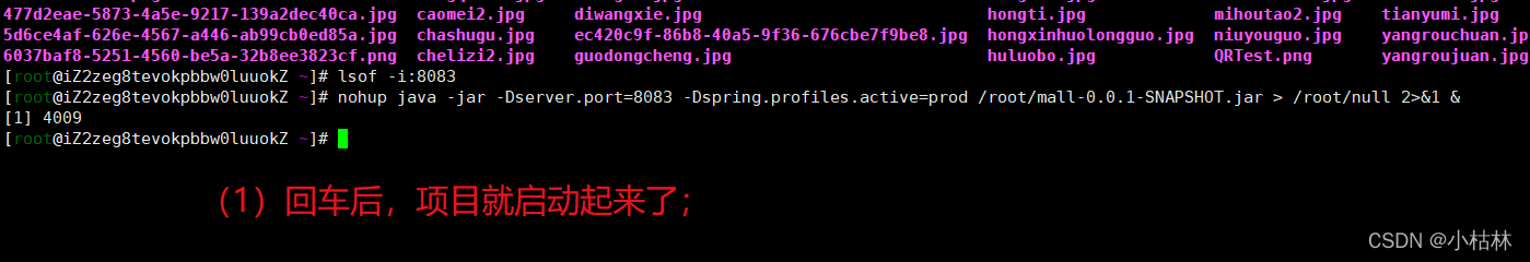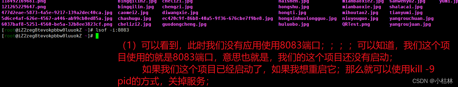 4.确认,使用了8083的本项目,有没有启动:使用【lsof -i:端口号】,查看8083端口号,是否有应用占用;如果有,就清理掉,然后重启项目;