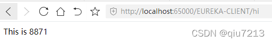 通过 gateway 访问 EUREKA-CLIENT 微服务:?http://localhost:65000/EUREKA-CLIENT/hi? 调用两次可以看到 gateway 自动帮我们完成了负载均衡。