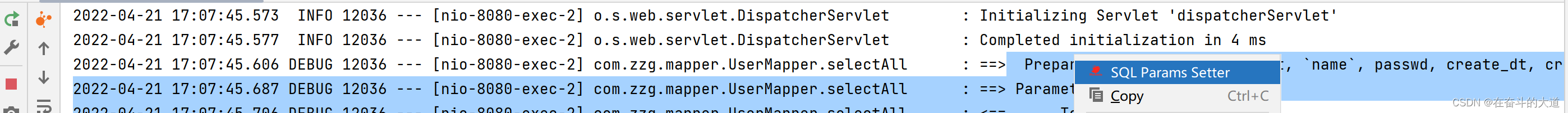 2022-04-21 17:07:49.317 DEBUG 12036 --- [nio-8080-exec-1] com.zzg.mapper.UserMapper.selectAll : ==> Parameters: