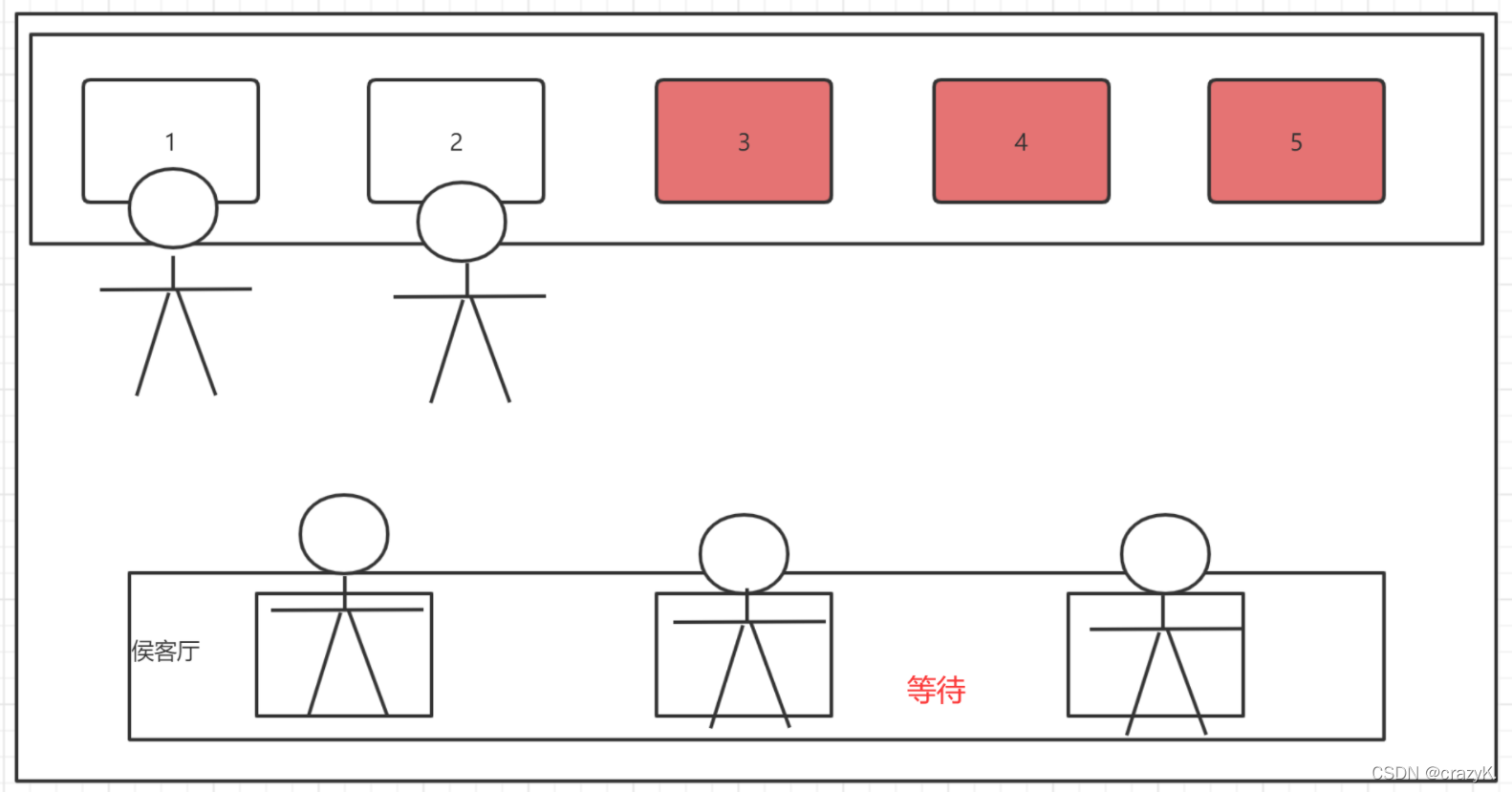 平时银行只开放两个办理业务窗口,当两个窗口都有人时,新来的客户会进入侯客厅等待,当人过多时3,4,5窗口会打开进行业务办理
