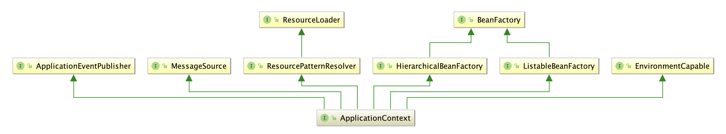 以上是Spring IOC容器中接口的继承关系,其中ApplicationContext 接口是BeanFactory 的子接口。