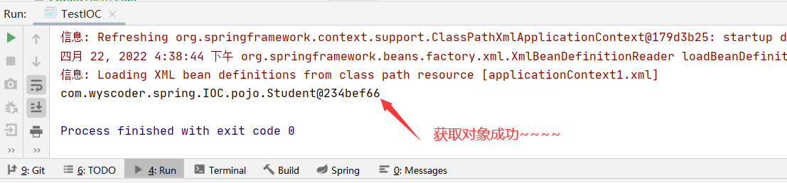 执行结果:  以上执行结果可知:可以通过容器来获取对象实例