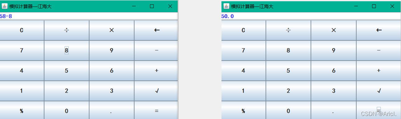 ?? ? ? ? 代码思路:以 8+5 该运算表达式为例。先从文本框input中获取用户通过按钮组件输入的计算表达式字符串“8+5”,先将其转换成字符数组,如果是双目运算,先通过循环找到运算符的位置,然后利用StringTokenizer类中的字符分割编辑的方法substring(a,b),获取字符串中下标从a开始,b-1结束的字符串(左闭右开区间),实现以运算符为分界线,将两个数字字符分割出来,即分别获得了'8'和'5'这两个字符,再利用Double.parseDouble()的方法将其变为可进行运算的浮点数8.0和5.0,最后根据不同的运算符进行相应的计算,将结果保存到变量result中。单目运算符同理,只不过分割后只有一个左操作数没有右操作数。