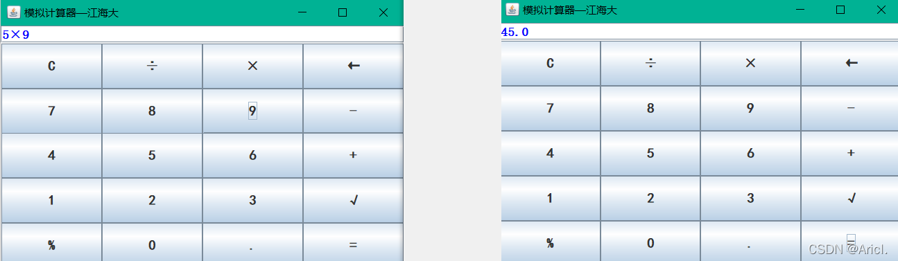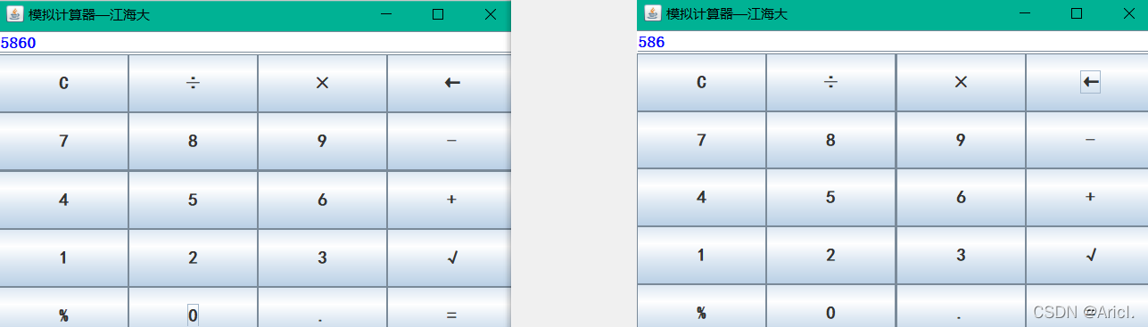 (2)辅助功能:按钮“C”实现清空文本框;按钮“←”实现退格,删除文本框中最右边的一个字符