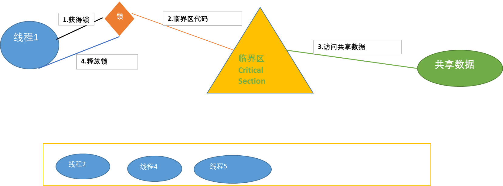- 锁的实现是利用互斥对象机制的思想完成的。即一次共享数据只能被一个线程访问。