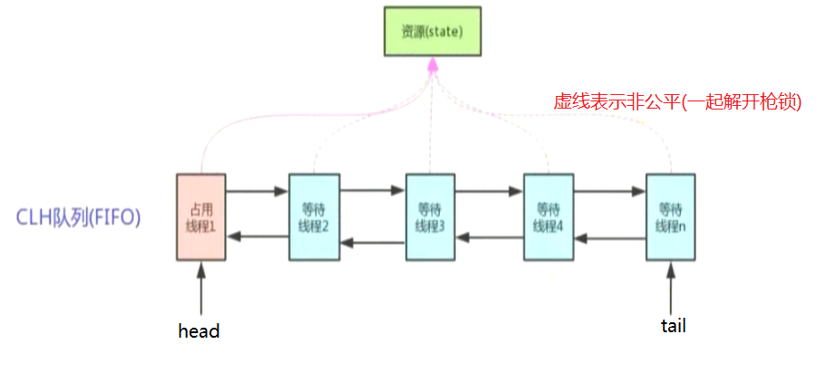 - AQS内部将请求共享资源的线程包装成CLH锁队列的一个节点Node实现锁分配