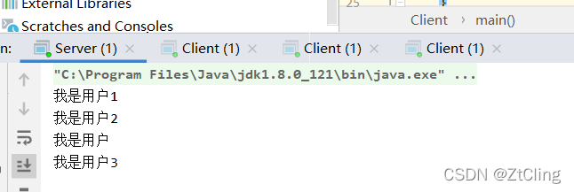 5)以上代码即可完成3名客户对服务端的通信,我们运行一下