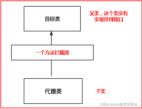 代理类去继承目标类,每次调用代理类的方法都会被方法拦截器拦截,在拦截器中才是调用目标类的该方法的逻辑