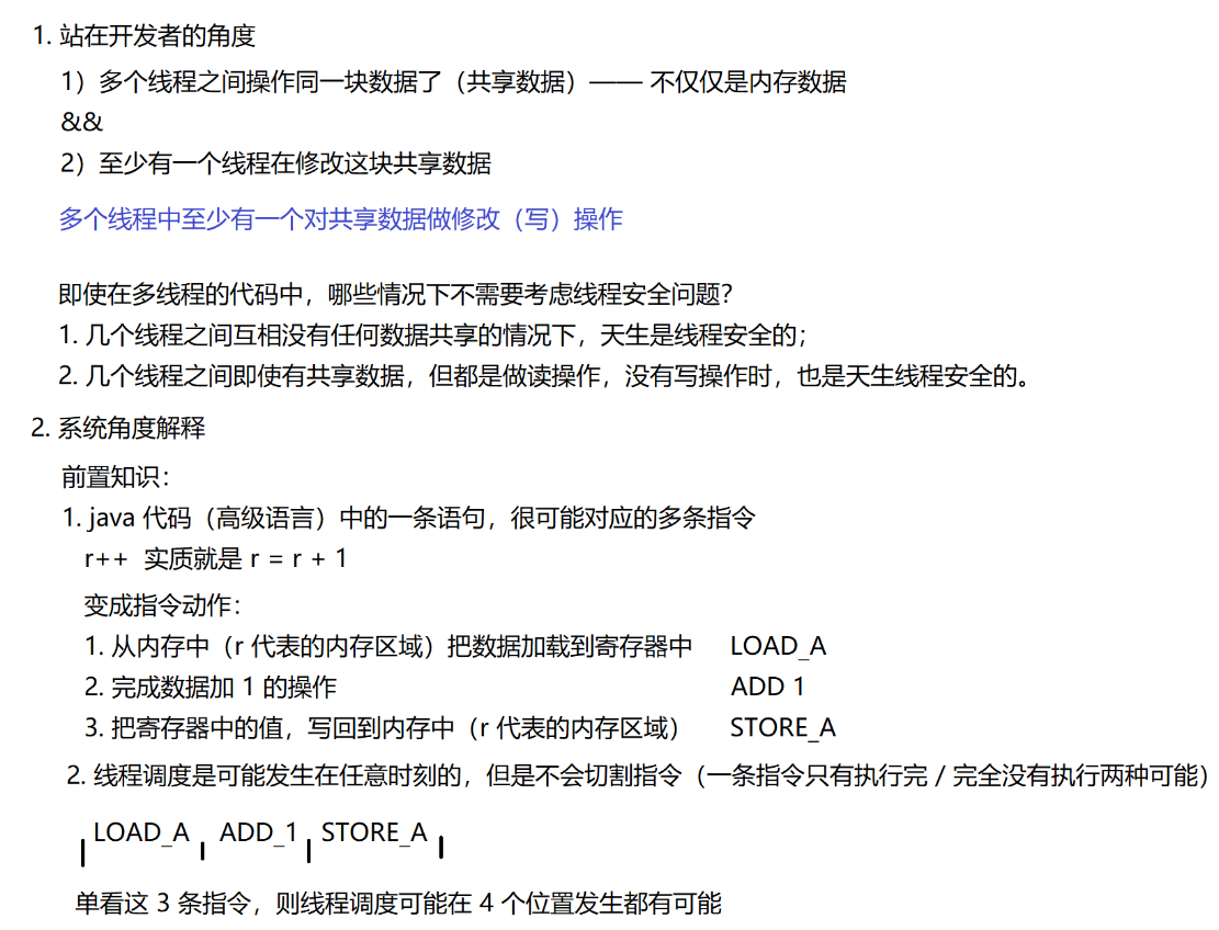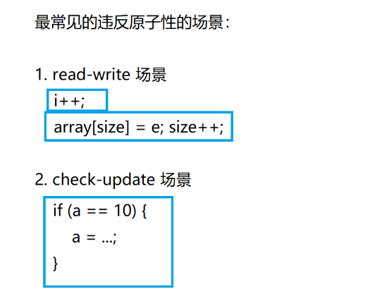 1.尽可能让几个线程之间不做数据共享,各干各的。就不需要考虑线程安全问题了 比如对一个数组的归并排序:4个线程虽然处理的是同一个数组,但提前划好范围,各做各的,就没问题了 2.如果非要有共享操作,尽可能不去修改,而是只读操作 static?final?int?COUNT=;即使多个线程同时使用这个COUNT也无所谓的 3.一定会出现线程问题了,问题的原因从系统角度讲: 1.原子性被破坏了 2.由于内存可见性问题,导致某些线程读取到“脏(dity)” 3.由于代码重排序导致的线程之间关于数据的配合出问题了 原子性就是一个操作要么全部完成,要么都不完成。