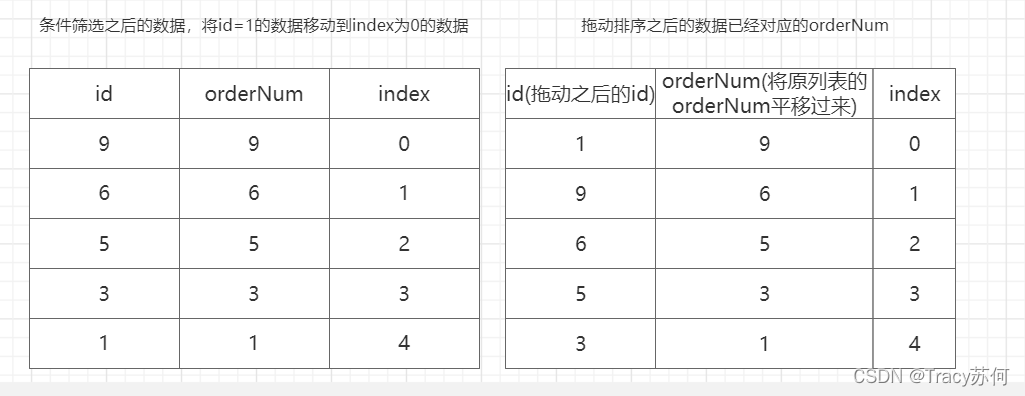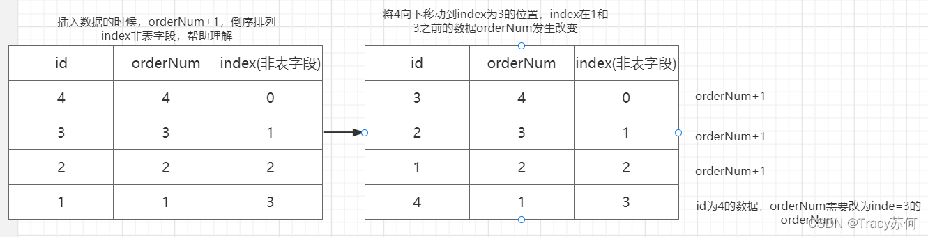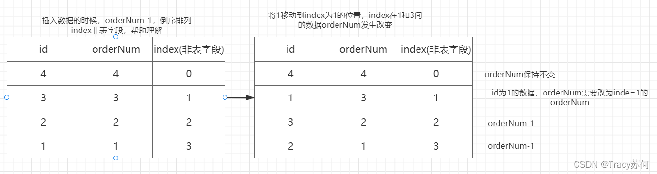 - 拖动排序的时候是支持条件搜索的,那说明我们列表展示的数据orderNum不是连续的数值,只是相对有序,我们对区间数据orderNum进行+1或者-1的时候可能导致数据表中的orderNum重复。