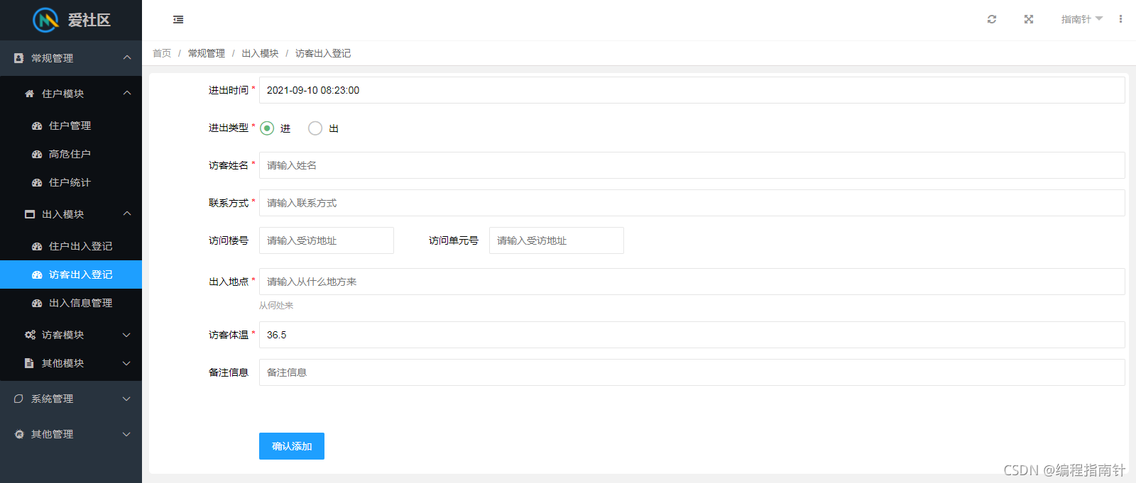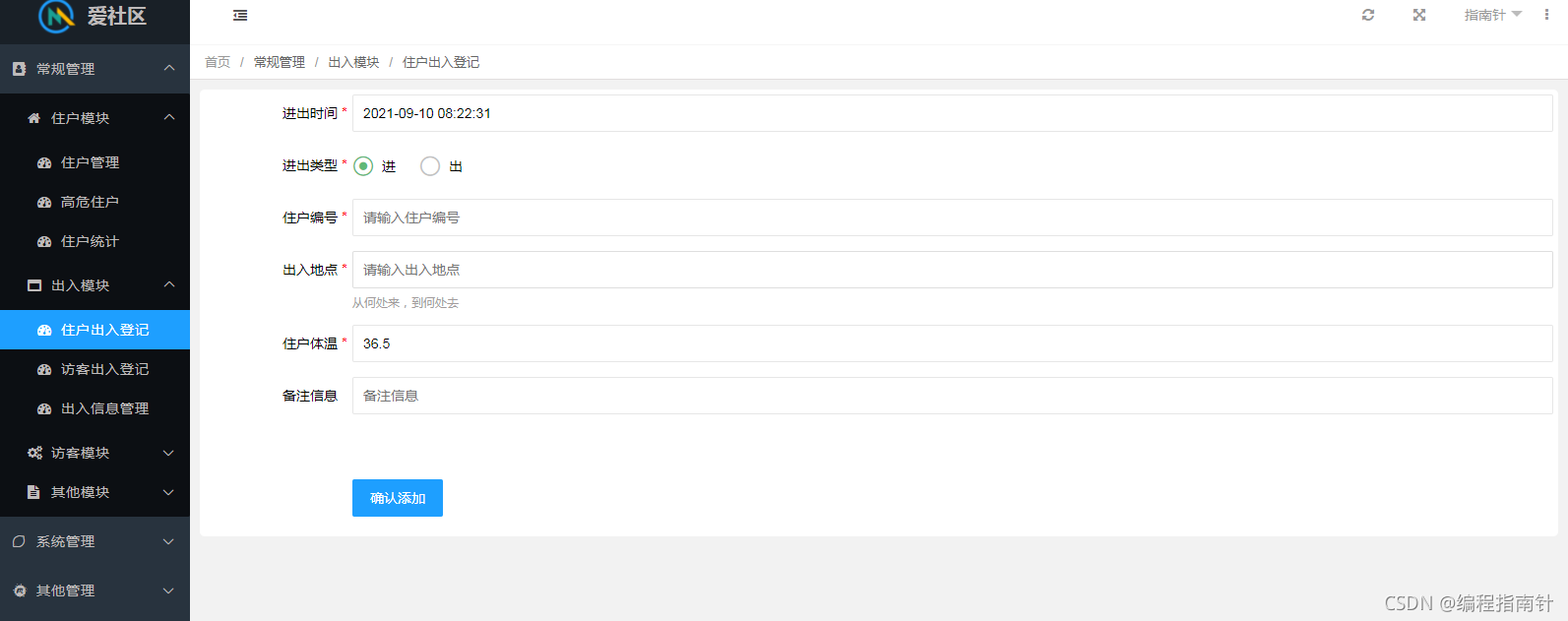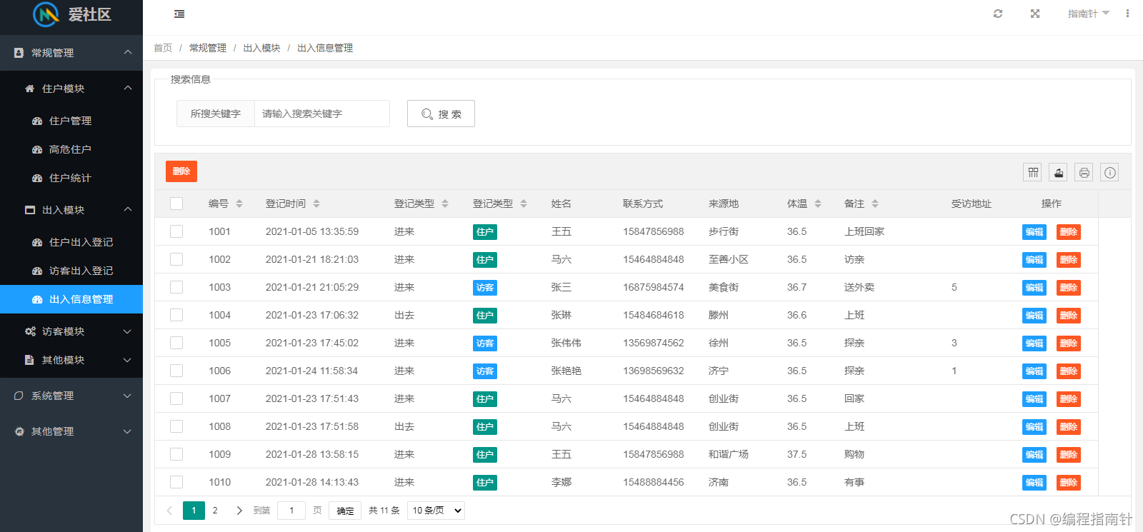 以上是展示的疫情期间社区对人口流动的管理系统的部分基本功能,项目功能完整,页面简洁