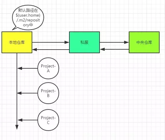 Maven标准目录结构Maven的几个核心概念POMPOM(Project Object Model)项目对象模型,一个项目所有的配置都放在POM文件中:定义项目的类型、名字、管理依赖关系,定制插件的行为等等。 Maven通过pom.xml文件来管理依赖和管理项目的构建生命周期,而项目构建的生命周期是依靠一个个的插件完成的。 Maven仓库Maven管理资源的位置。仓库里面包含依赖(jar包)和插件(plug-in)。Maven仓库分为本地仓库和远程仓库,而远程仓库又包括私服和中央仓库。 Maven仓库 本地仓库用户自己电脑上的仓库,直接从本地获取。 远程仓库私服私服是一种特殊的远程仓库,搭建在局域网内的仓库,私服代理广域网的仓库,提供给局域网内的用户使用,可用减少局域网内的用户与外界仓库的传输,每一个jar包只需要拉取一次就可以提供给局域网内所有的用户使用,并且也更加稳定。 中央仓库Maven官方提供的远程仓库,里面拥有最全的jar包资源,Maven首先从本地仓库中寻找项目所需的jar包,若本地仓库没有,再到Maven的中央仓库下载所需jar包。 坐标在Maven中,坐标是jar包的唯一标识,Maven通过坐标在仓库中找到项目所需的jar包。