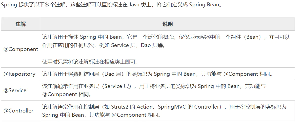 @Component作用就是注解在一个类上,表示将此类标记为Spring容器中的一个Bean,实现bean的注入,它的三个衍生注解:@Controller、@Service、@Repository