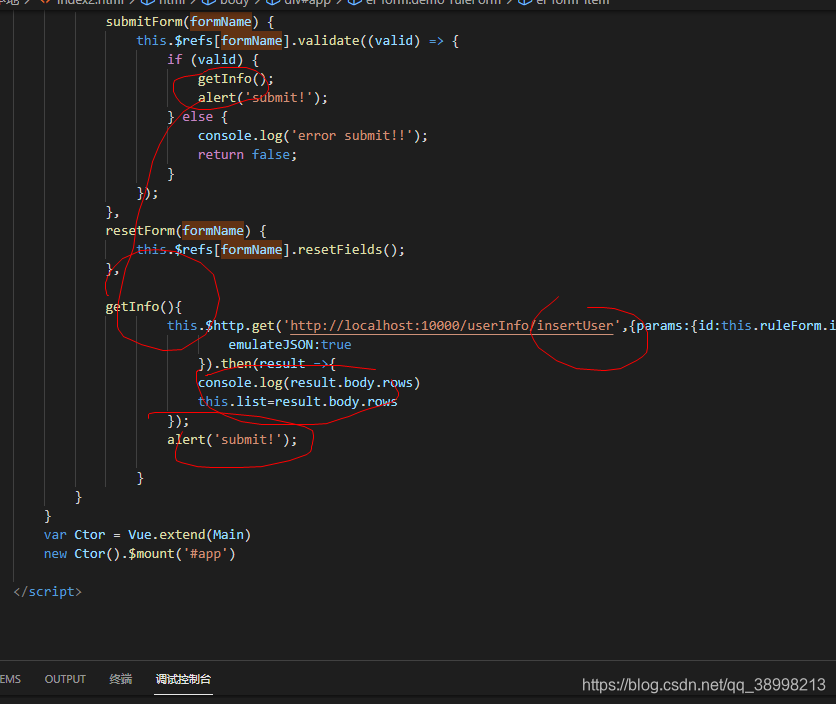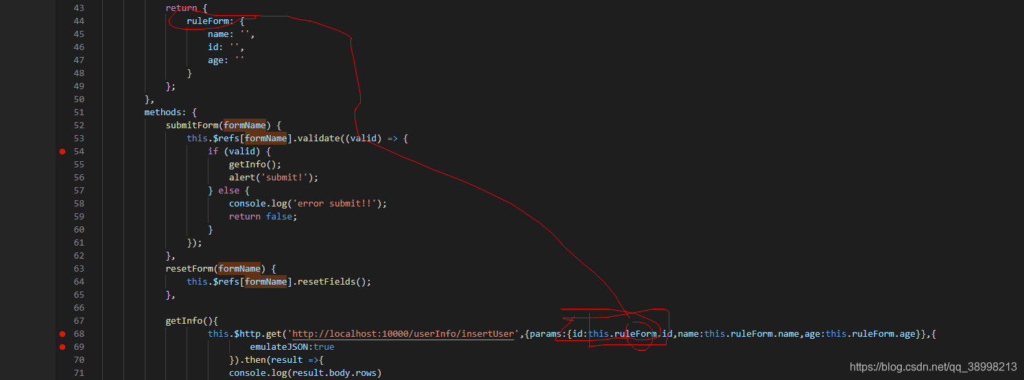 this.$http.get('http://localhost:10000/userInfo/insertUser',{params:{id:this.ruleForm.id,name:this.ruleForm.name,age:this.ruleForm.age}},{