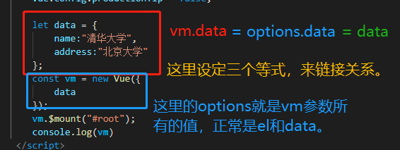 //这里的data存在了vm实例对象本身,但在控制台端输入vm._data,得到的结果就是这里的data属性。