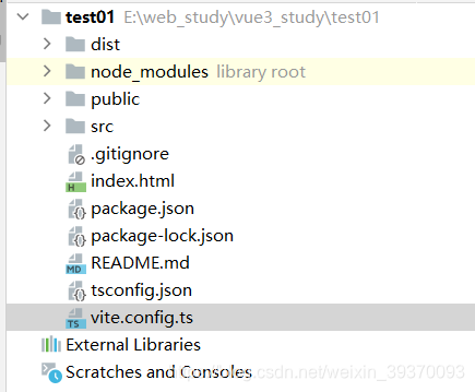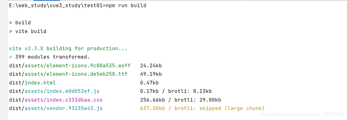 vite的配置都在根目录下面的?vite.config.ts里面,在没有对其进行打包配置时,默认的打包的入口就是根目录的【index.html】。这时候我们直接运行 npm run build就会打包相应的文件: