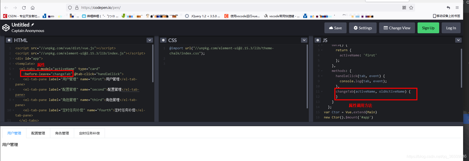 ????????通过上图,关于<el-tabs></el-tabs>的七个属性我们已经介绍了6个,剩下一个第7个属性,大家可以看到该属性绑定了一个函数,是在切换tab之前触发的一个钩子,