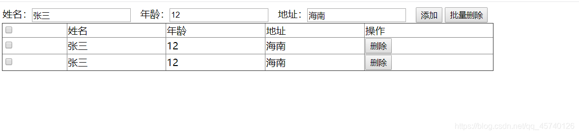 var str=$('<tr>'+'<td>'+'<input type="checkbox">'+'</td>'+'<td>'+realName+'</td>'+'<td>'+age+'</td>'+'<td>'+address+'</td>'+'<td>'+'<input type="button" value="删除" onclick="delBtn(this)">'+'</td>'+'</tr>');