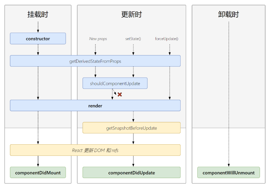 - 卸载组件: 由ReactDOM.unmountComponentAtNode()触发