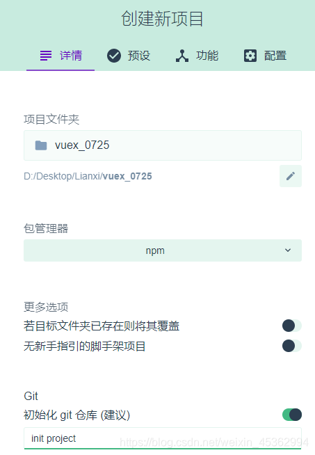 回车 接下来问你Save this as a preset for future projects? (y/N) 是否将你刚才的一系列选择来保存一下 下次可快速创建全新的项目