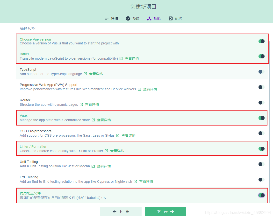 1.Choose Vue version(选择版本号)在下一步配置中可以选择 2.x 或3.x 2.Babel(在webpack 中,默认只能处理 一部分 ES6 的新语法,一些更高级的ES6语法或者 ES7 语法,webpack 是处理不了的;这时候就需要 借助于第三方的 loader,来帮助webpack 处理这些高级的语法,当第三方loader 把 高级语法转为 低级的语法之后,会把结果交给 webpack 去打包到 bundle.js 中) 3.TypeScript(支持typeScript写源码) 4. Progressive Web App (PWA) Support(这个意思暂且不明白) 5. Router(自动配置路由) 6. Vuex(自动配置vuex 全局状态管理) 7. CSS Pre-processors(支持css预处理器) 8. Linter / Formatter(代码规范) 9. Unit Testing(支持单元测试) 10. E2E Testing(支持E2E测试)