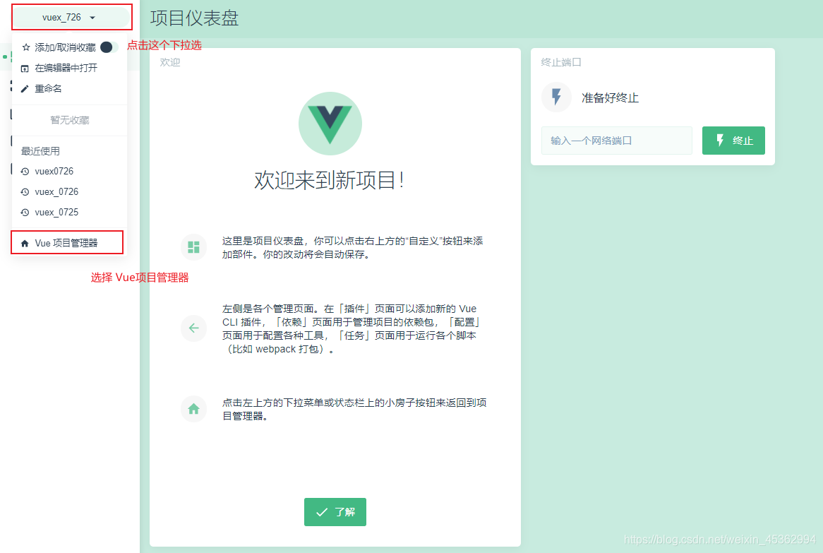 2. 点击左上角的下拉选? 选择Vue项目管理器