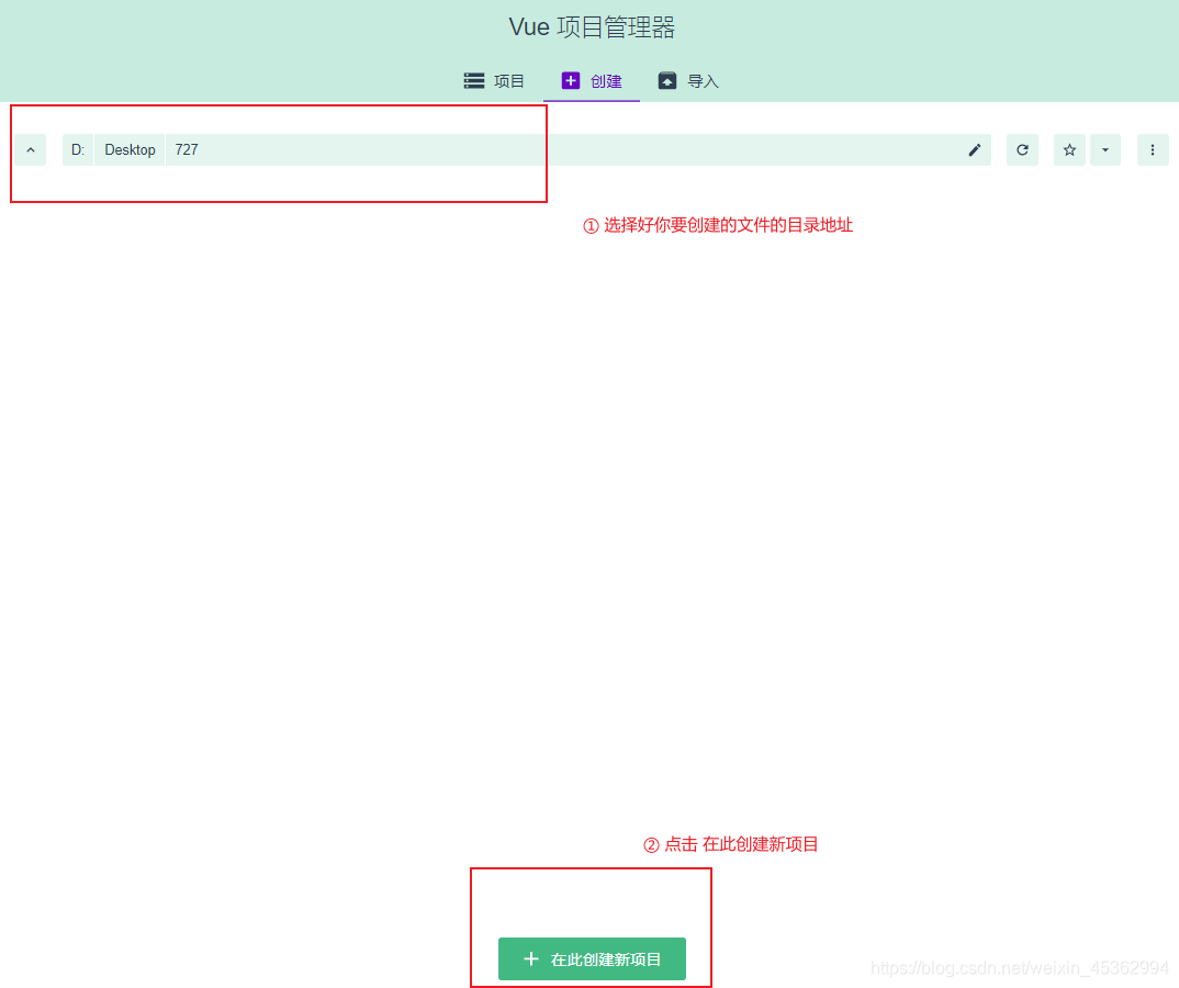 3. 选择要创建的文件的目录地址??点击 在此创建新项目?
