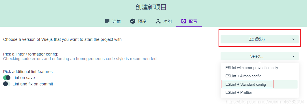 上一步选择了choose vue version? 则在配置页可选择2.x 或者3.x