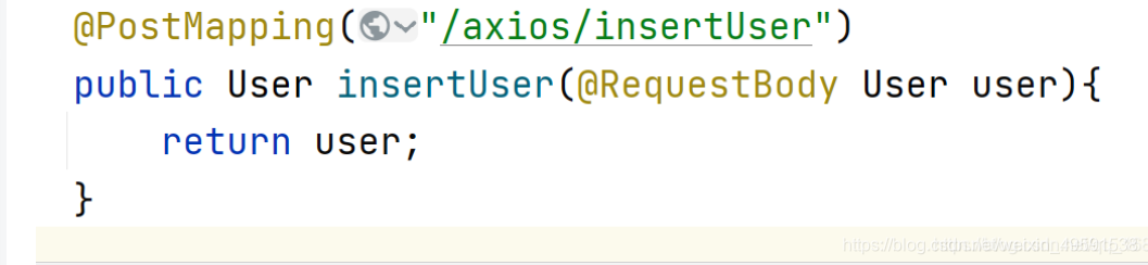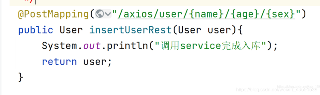 let user = { ?? ??? ??? ??? ??? ??? ?name: "post请求的语法", ?? ??? ??? ??? ??? ??? ?age: 20, ?? ??? ??? ??? ??? ??? ?sex: '女' ?? ??? ??? ??? ??? ?} ?? ??? ??? ??? ??? ?let url1 = "http://localhost:8090/axios/insertUser" ?? ??? ??? ??? ??? ?axios.post(url1, user) ?? ??? ??? ??? ??? ??? ??? ? .then(function(result){ ?? ??? ??? ??? ??? ??? ??? ??? ? console.log(result.data) ?? ??? ??? ??? ??? ??? ??? ? })