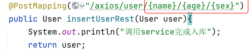 ?? ?/** ?? ??? ??? ? * restFul风格实现业务传参? ?? ??? ??? ? * 需求: 根据name/age查询数据 ?? ??? ??? ? * URL: http://localhost:8090/axios/user/tomcat/18 ?? ??? ??? ? * 注意: 模版字符串优化参数 ?`` ?? ??? ??? ? */ ?? ??? ??? ?let name = "mysql" ?? ??? ??? ?let age = 20 ?? ??? ??? ?axios.get(`http://localhost:8090/axios/user/${name}/${age}`) ?? ??? ??? ??? ??? ? .then(function(result){ ?? ??? ??? ??? ??? ??? ? console.log(result.data) ?? ??? ??? ??? ??? ? }) ?