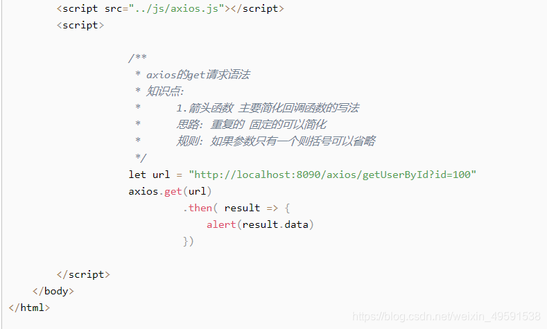 <!DOCTYPE html> <html> ?? ?<head> ?? ??? ?<meta charset="utf-8"> ?? ??? ?<title>Axios</title> ?? ?</head> ?? ?<body> ?? ??? ?<h1>Axios练习</h1> ?? ??? ?<!-- 引入JS文件 --> ?? ??? ?<script src="../js/axios.js"></script> ?? ??? ?<script> ?? ??? ??? ?/** ?? ??? ??? ? * 注意事项: ?? ??? ??? ? * ?? ??? ?1.Axios将原来的嵌套的结构,改为链式加载方式 ?? ??? ??? ? * ? ?2.回调函数中的data,不是服务器的返回值,是promise对象 ?? ??? ??? ? *? ?? ??? ??? ? * 发起Ajax请求: ?? ??? ??? ? * ?? ?1. GET请求获取数据 ?? ??? ??? ? */ ?? ??? ??? ?axios.get("http://localhost:8090/axios/getUser") ?? ??? ??? ??? ??? ? .then(function(result){//promise对象 ?? ??? ??? ??? ??? ??? ?//获取服务器返回值 ?promise.data ?? ??? ??? ??? ??? ??? ? console.log(result.data) ?? ??? ??? ??? ??? ? }) ?? ??? ??? ? ?? ??? ?</script> ?? ?</body> </html>