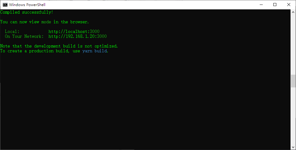 根据提示 使用cd进入项目目录 在执行 yarn start 启动项目 启动成功后  页面状态如下图