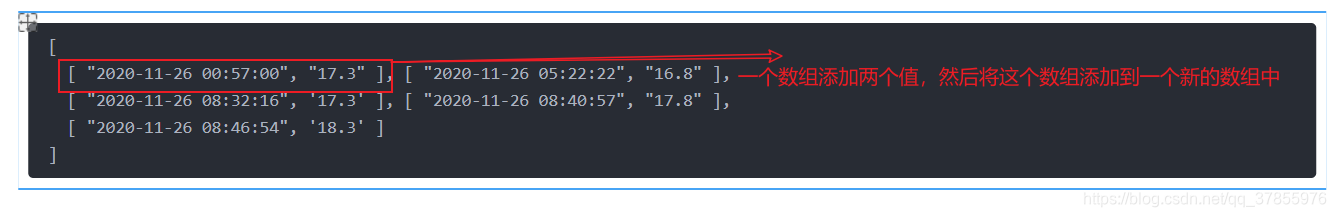 [ "2020-11-26 08:32:16", '17.3' ], [ "2020-11-26 08:40:57", "17.8" ],