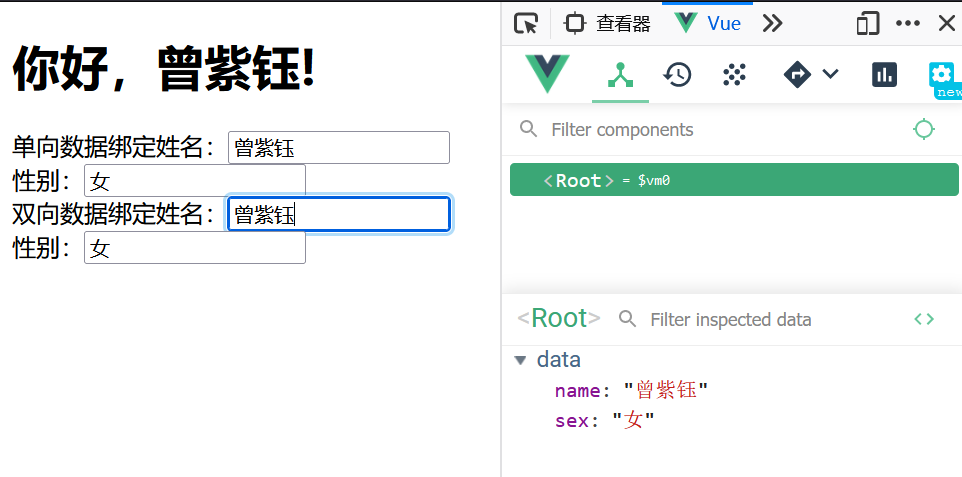 双向数据绑定姓名:<input type="text" v-model:value="name" /><br>
