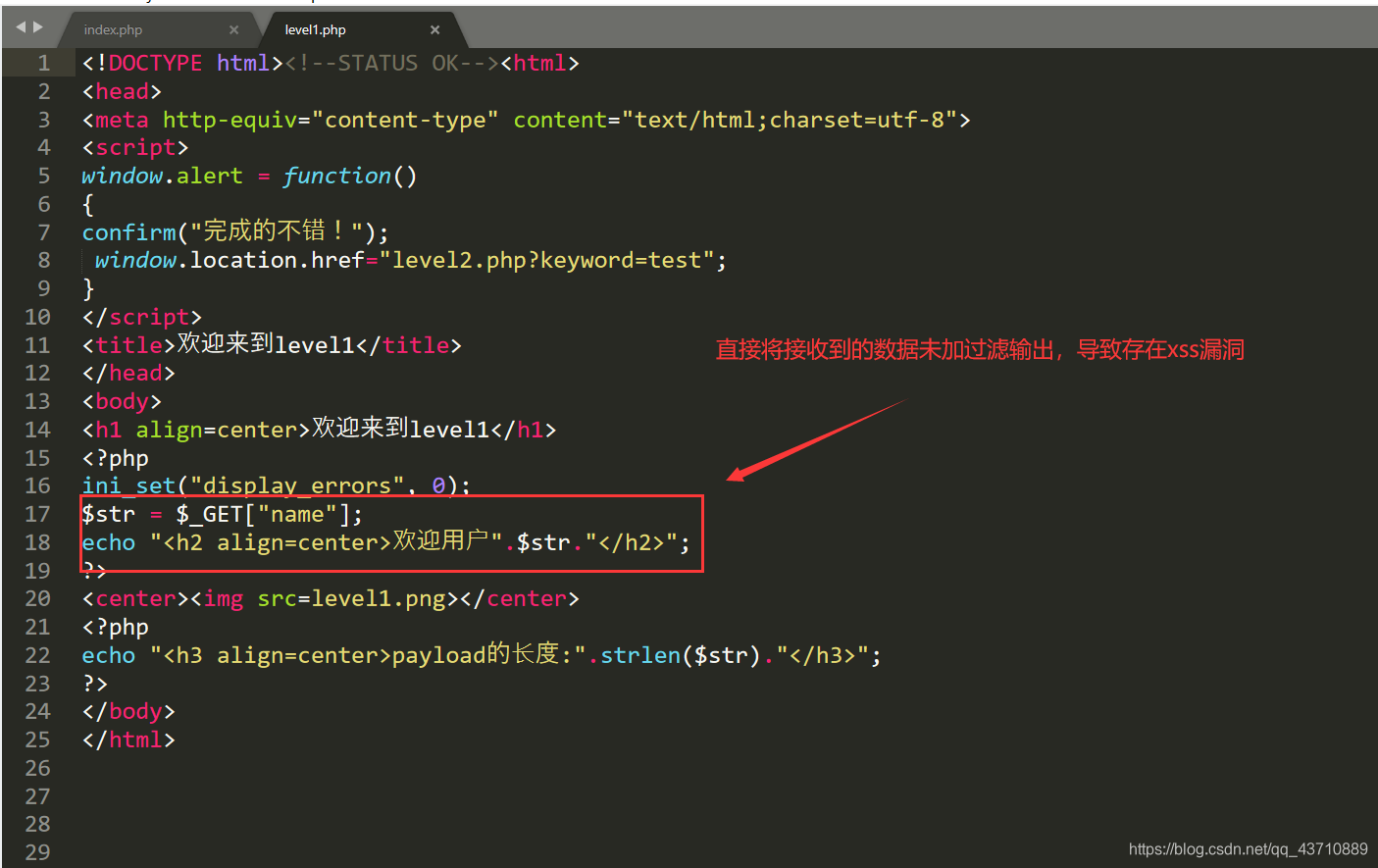 htmlspecialchars()  上图源码可知,使用get方式传递到服务器端的keyword参数的值赋值给str变量,然后使用htmlspecialchars()函数对变量进行处理后显示到网页上。但是直接将变量值插入到input标签的value属性值中,因为并没有对敏感字符进行编码和过滤,所以可以通过构造实现XSS攻击