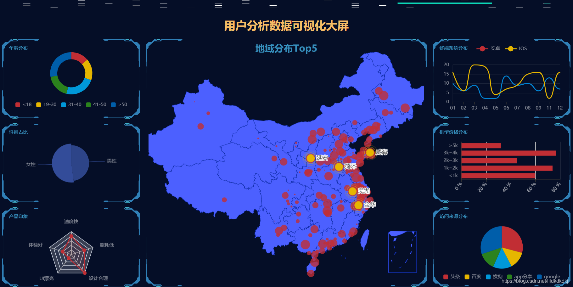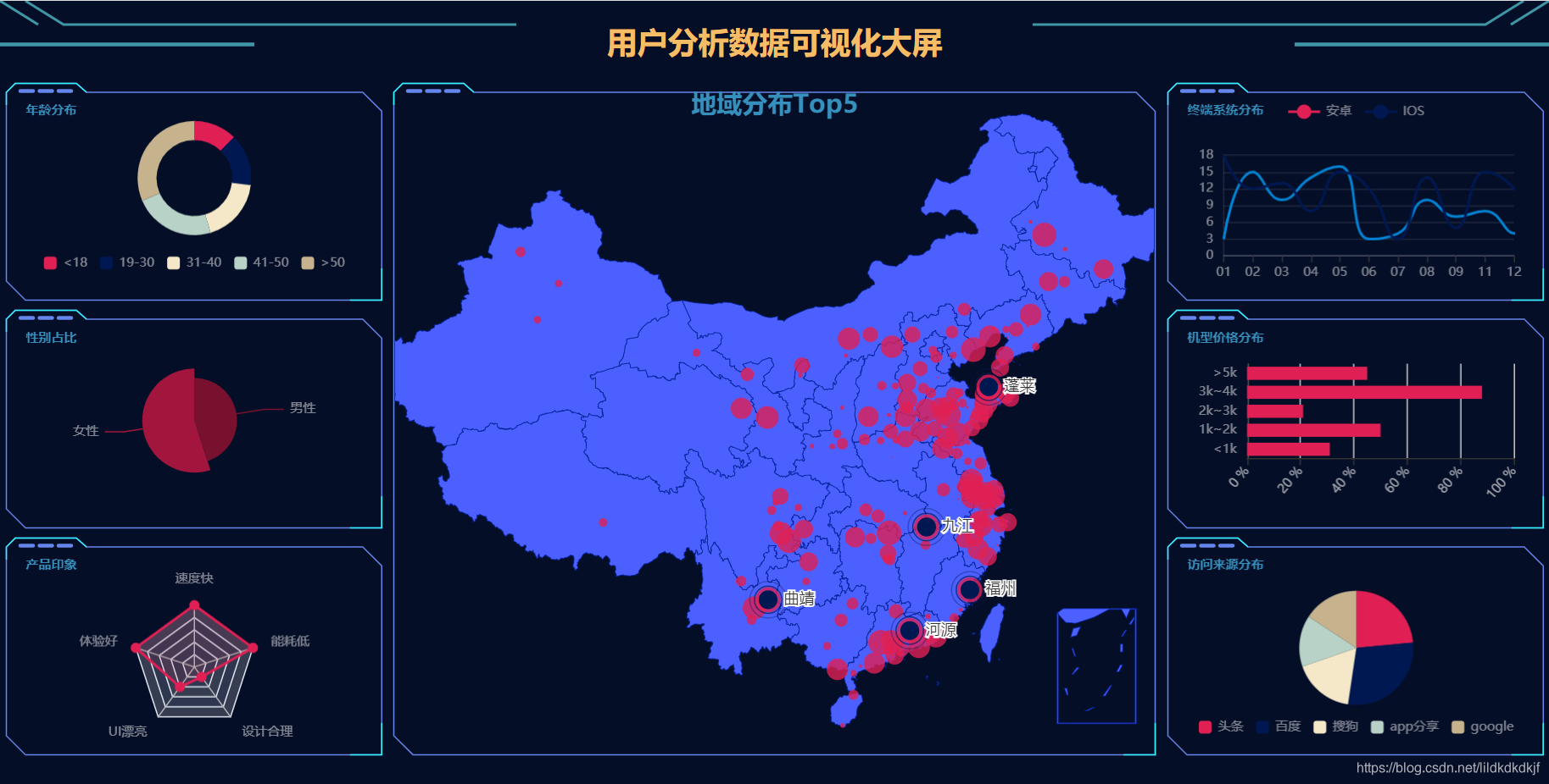 近年来,数据可视化大屏的出现,掀起一番又一番的浪潮,众多企业主纷纷想要打造属于自己的 “酷炫吊炸天” 的霸道总裁大屏驾驶舱。今天为大家分享的是?【用户行为?数据可视化大屏】。