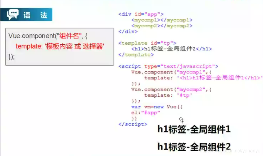 全局组件 说明: 1.全局组件的声明,必须编写在任何js方法体之外. 2.组件内容中 有且只有 1个根标签,包裹其他内容. 3.template标签是Vue提供的一个标签,必须声明template标签来定义组件内容.  示例
